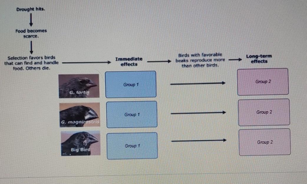 The Big Birds and G. Which means there is no competition as the other species have a preference for small seedsThey can outcompete all other finches. Magnirostris and the big bird lineage what do you predict will happen as the drought continues.